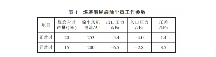 某公司二線煤磨磨尾袋除塵器型號 LPM8C -950M,風(fēng)機(jī)型號 Y315L-4,額定功率 185kW、額定電流 334A。2011 年投入使用初期,袋式除塵器進(jìn)出口壓差大,其工作參數(shù)見表 1。