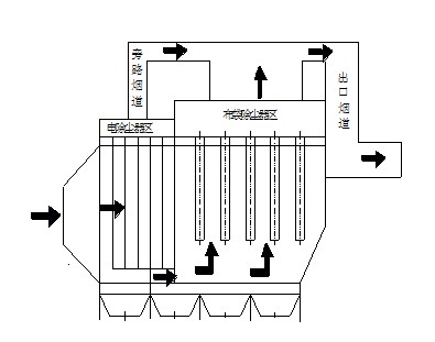 含塵氣體在引風(fēng)機(jī)的作用下,首先進(jìn)入煙氣預(yù)處理室,在預(yù)處理室內(nèi)對高溫氣體進(jìn)行降溫除火星、高比電阻粉塵進(jìn)行降電阻處理、過于干燥煙氣進(jìn)行適量增濕(濕度應(yīng)≤10%,以減少二次揚(yáng)塵)。處理后的煙氣通過氣流均布裝置均勻進(jìn)入高壓電場,在高壓電場內(nèi),含塵顆粒荷電后在電場力的作用下偏離主氣流方向,趨向收塵電極,被收塵電極所捕集,收塵電極上的灰塵經(jīng)過一段時間累積后,由振打控制器發(fā)出振打信號,通過高頻振打,灰塵落入灰斗,80%~90%粉塵由電收塵部分收集;經(jīng)過高壓靜電除塵后的氣體,在通過導(dǎo)向裝置,進(jìn)入布袋除塵器的進(jìn)氣室,由外而內(nèi)通過除塵布袋元件,粉塵顆粒被阻留在布袋外側(cè)而將氣體再次凈化,除塵布袋外的粉塵通過設(shè)計的定時清灰或定阻清灰程序進(jìn)行清灰。潔凈氣體則通過布袋進(jìn)入排氣室,通過管道由風(fēng)機(jī)排入大氣。