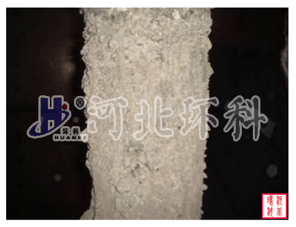 圖1為某工業(yè)垃圾焚燒除塵器中濾袋酸結(jié)露造成糊袋的照片. 該除塵器運(yùn)行溫度穩(wěn)定在150℃左右,但 由于其主要焚燒處理的物質(zhì)是成份復(fù)雜的固體、液體和氣體等化工企業(yè)的廢棄物,所以煙氣中的水和硫化物含量變化很大(水含量甚至超過(guò)25%),露點(diǎn)溫度上下波動(dòng)幅度非常大。結(jié)露無(wú)可避免,糊袋極其嚴(yán)重。同時(shí),由于酸性物質(zhì)的滲透和長(zhǎng)時(shí)間的運(yùn)行,灰塵在濾袋表面逐漸結(jié)殼,致使濾袋透氣量喪失.